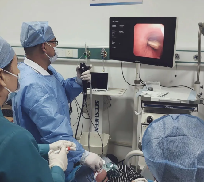 “时间就是生命,责任重于泰山!”孙占元主任第一时间启动气管异物急诊急救预案,带领科室团队快速完成术前评估与准备,同步协调内镜诊疗科、手术麻醉科开展多学科联合急救。在严密监护与麻醉支持下,为患儿实施急诊支气管镜异物取出术。