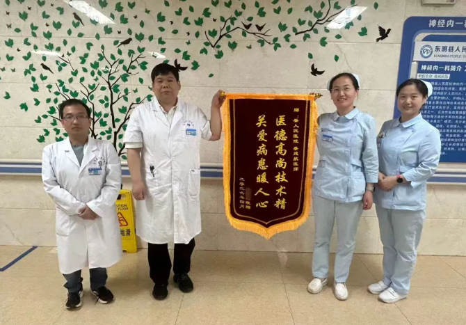 近日,东明县人民医院收治一名脑梗死患者,通过及时、规范的综合诊疗,患者病情逐步改善,顺利出院。患者及家属为表达感谢,向医护团队赠送锦旗一面,展现了和谐的医患关系。