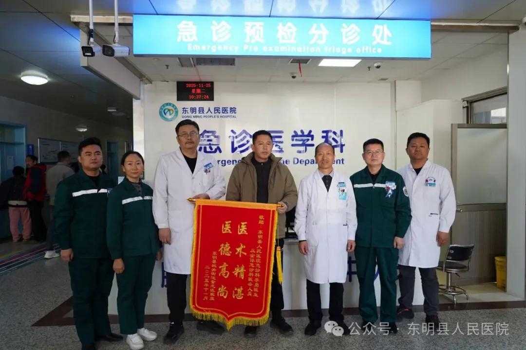 11月25日上午,患者董某某(化名)家属将一面印有“医术精湛,医德高尚”的锦旗送至东明县人民医院急诊科,向参与救治的医护团队表达诚挚谢意,锦旗背后是一场与时间赛跑的生命救援。